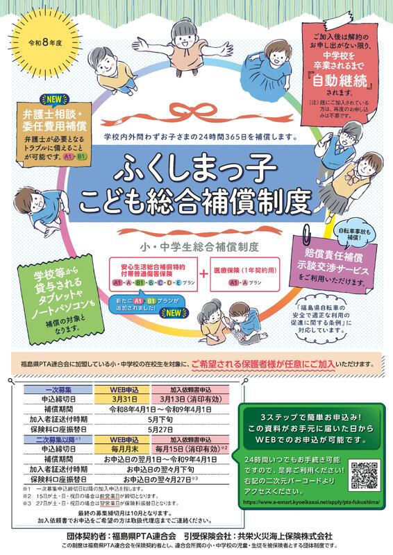 R8年度 ふくしまっ子こども総合補償制度(任意保険)パンフレット.pdf「加入案内・保護者配布の資料」(A4で12ページのチラシ)は、上をクリックしてダウンロード |